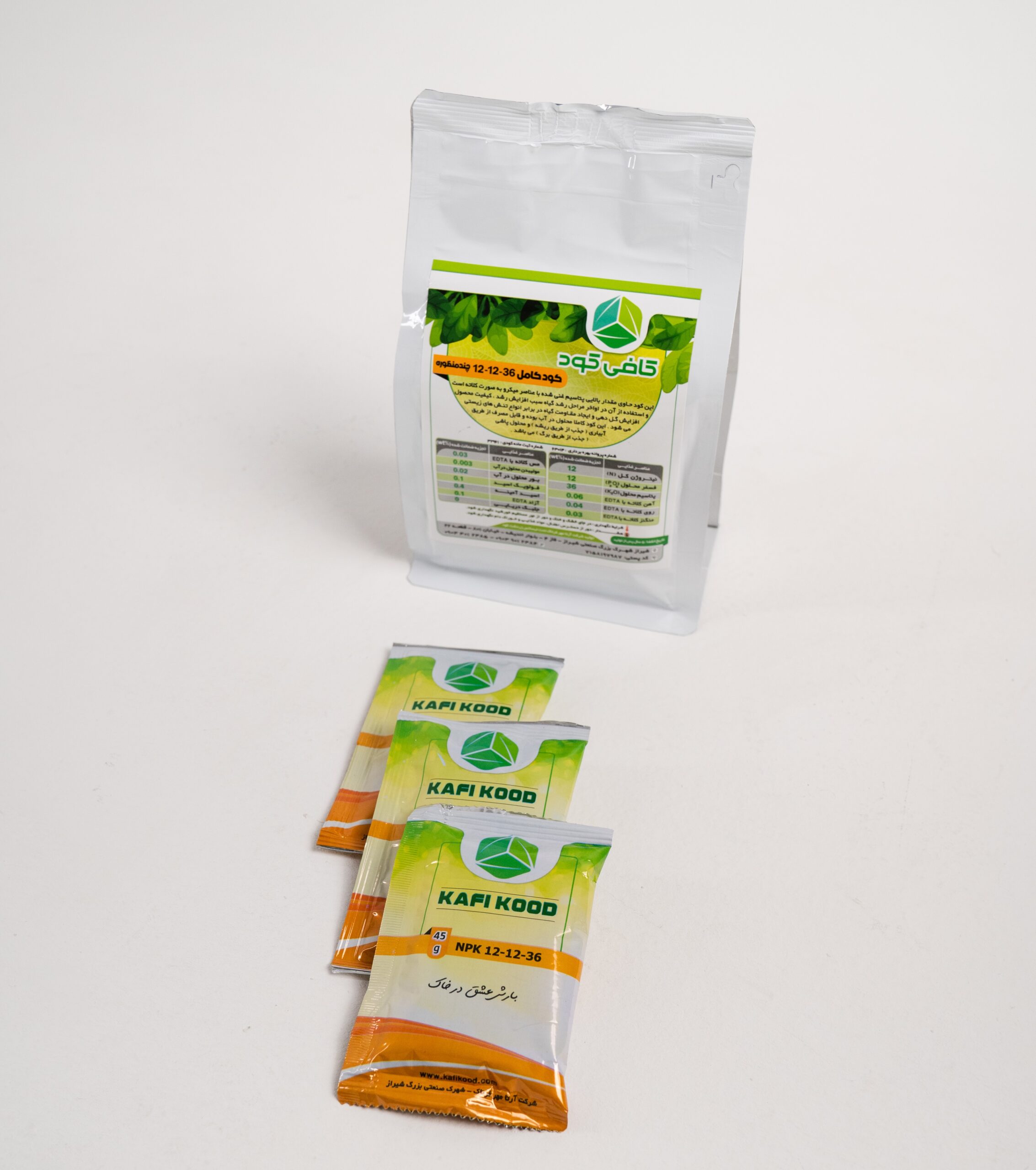 کود 36-12-12 یک کود شیمیایی است که حاوی سه عنصر اصلی نیتروژن (N)، فسفر (P) و پتاسیم (K) است، با درصدهای 12% نیتروژن، 12% فسفر و 36% پتاسیم. این کود همچنین حاوی عناصر ریزمغذی بصورت کلاته، فولویک اسید، هورمون رشد، اسید آمینه و EDTA است.